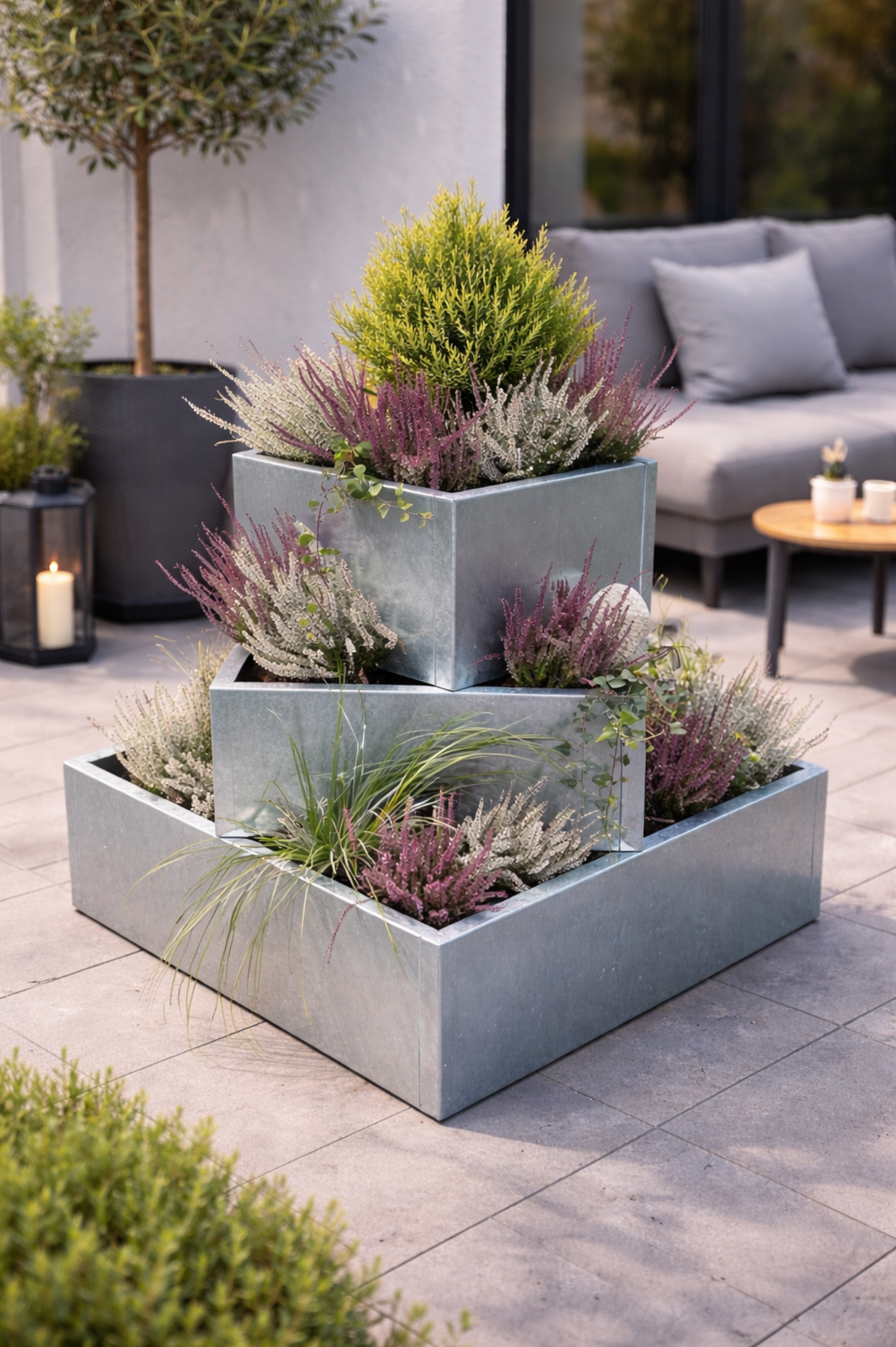 Giv din have et smukt midtpunkt med denne stilfulde blomsteropsats i tre niveauer. Designet skaber både højde og dybde, så dine planter virkelig kan komme til deres ret – perfekt til alt fra græsser, stauder og årstidens blomster.
