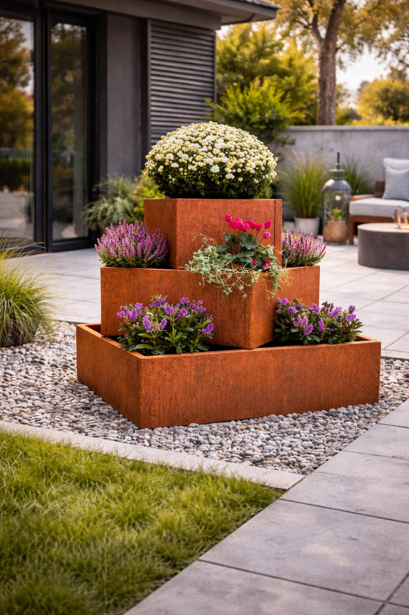 Elegant blomsteropsats i stål – et unikt blikfang til haven