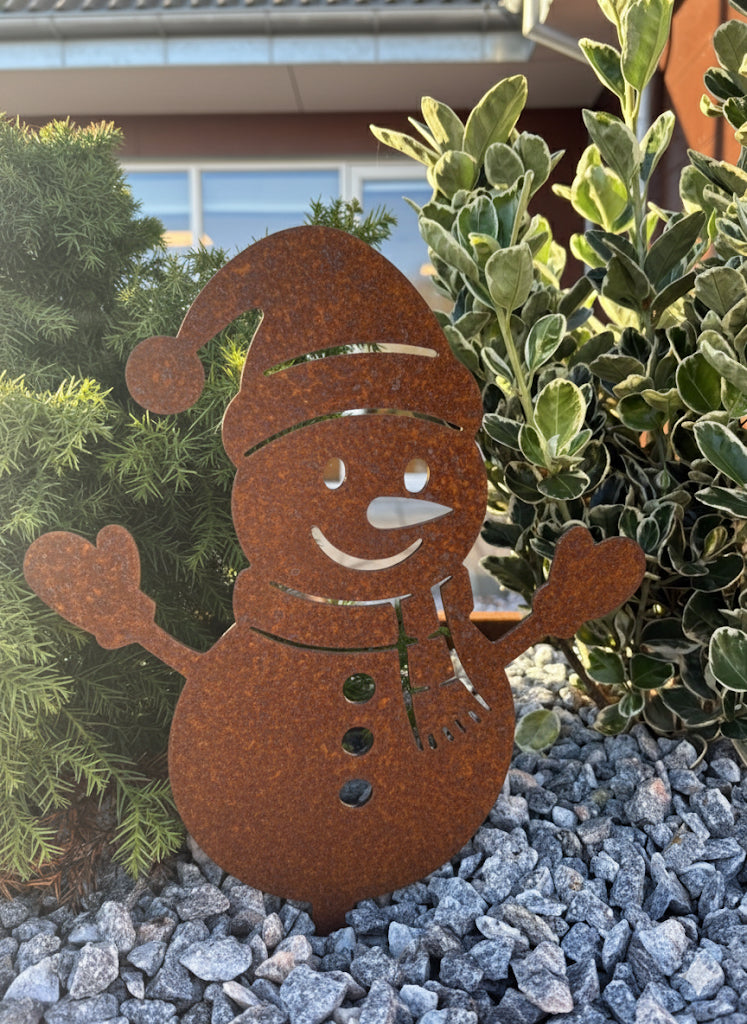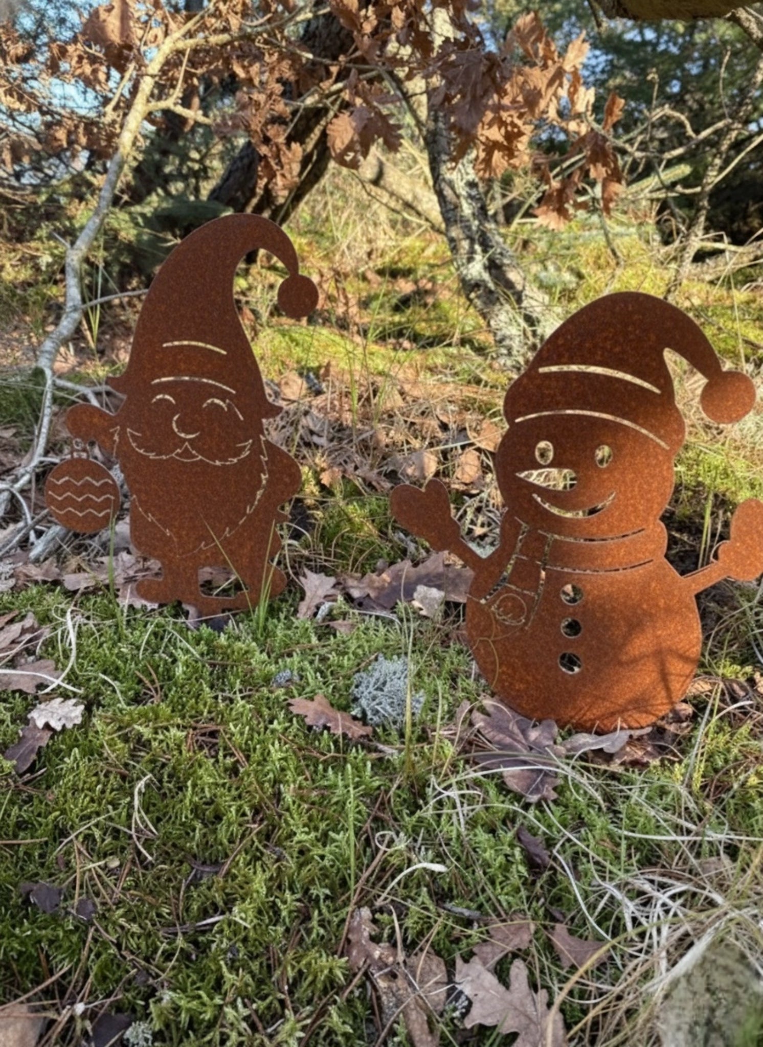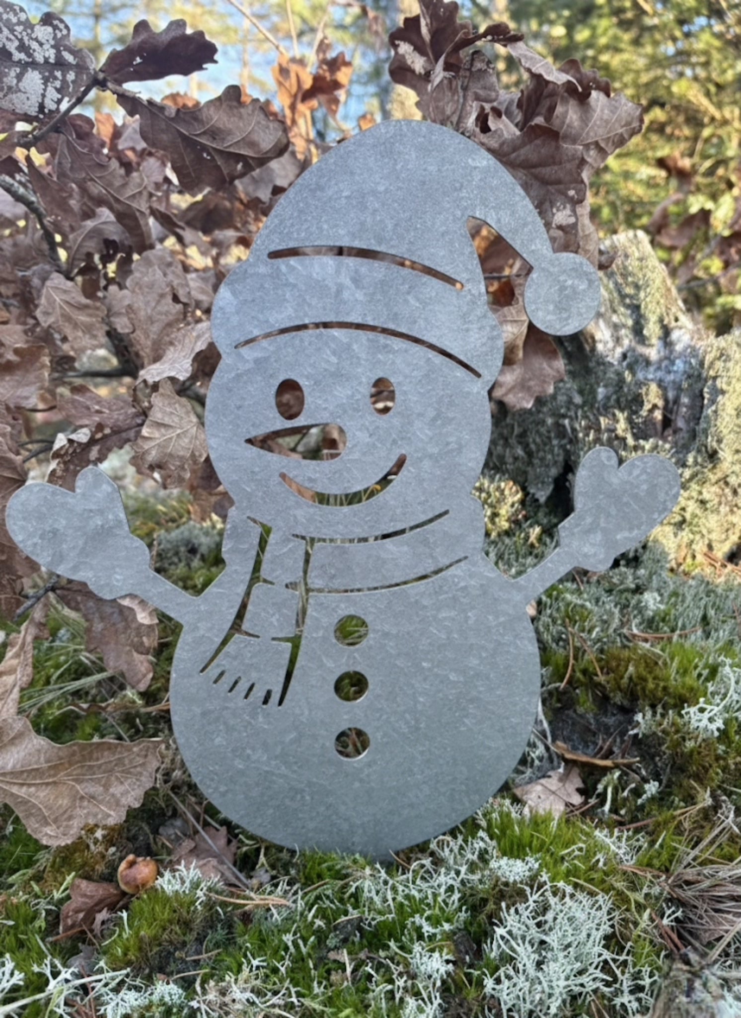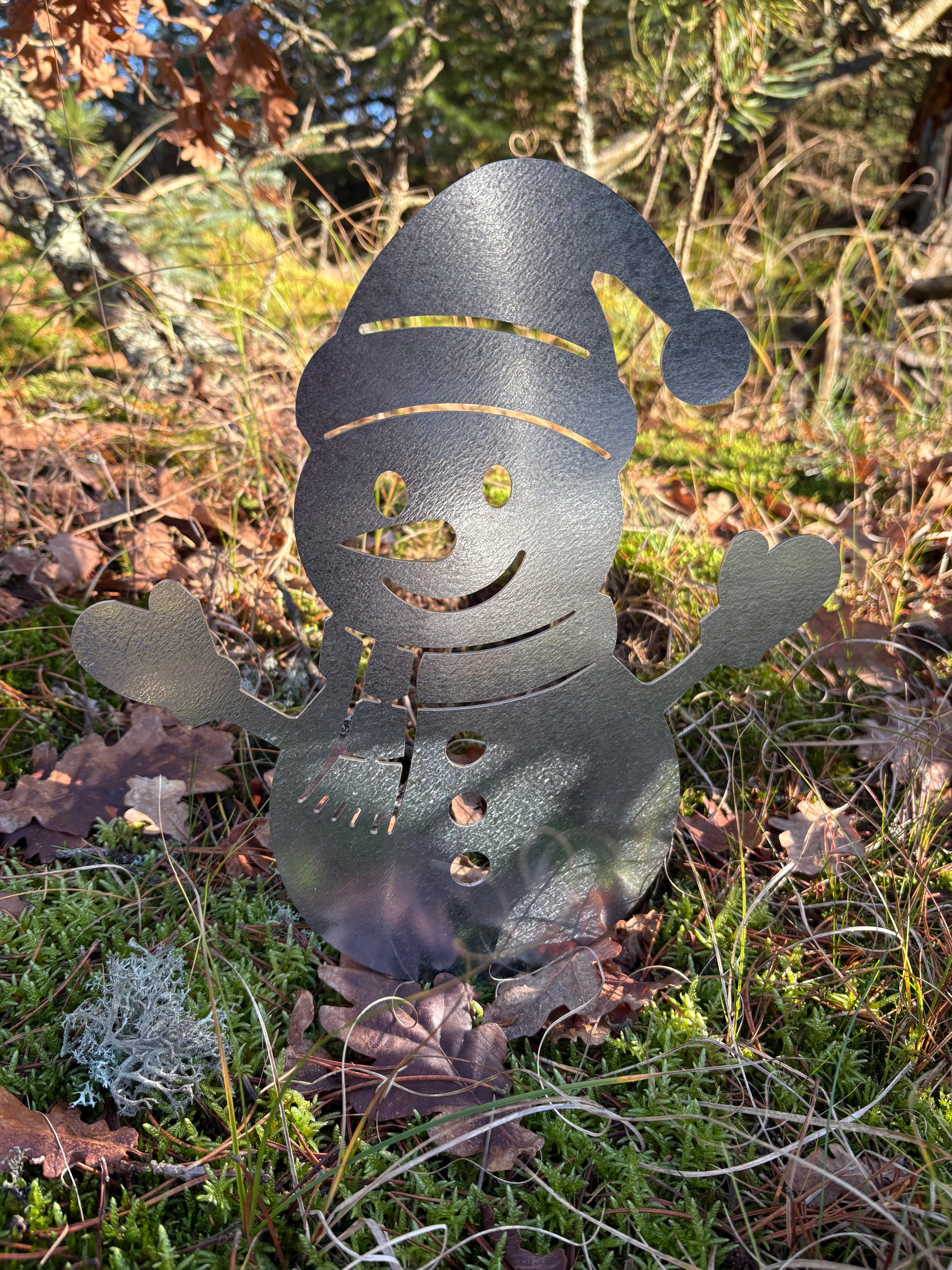 Snemandsfiguren fås i 3 mm cortenstål, som gradvist udvikler en smuk rustpatina – eller i 2 mm galvaniseret stål, der giver et mere lyst og råt look.