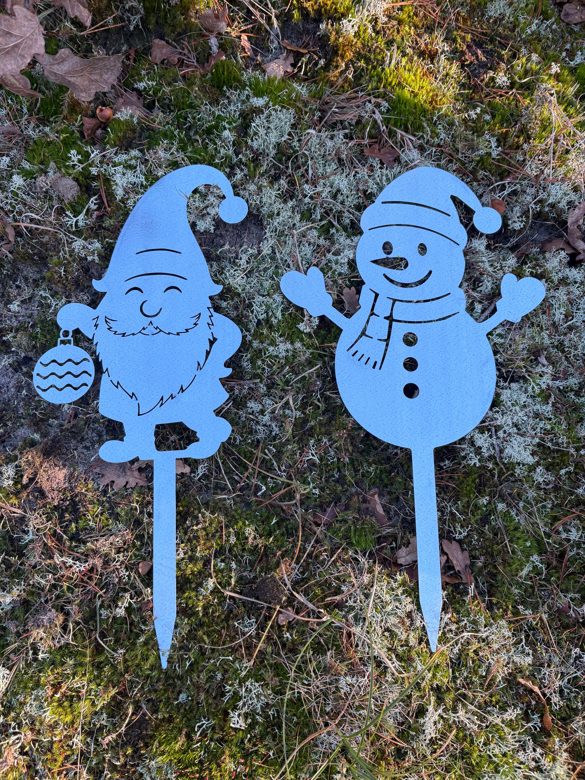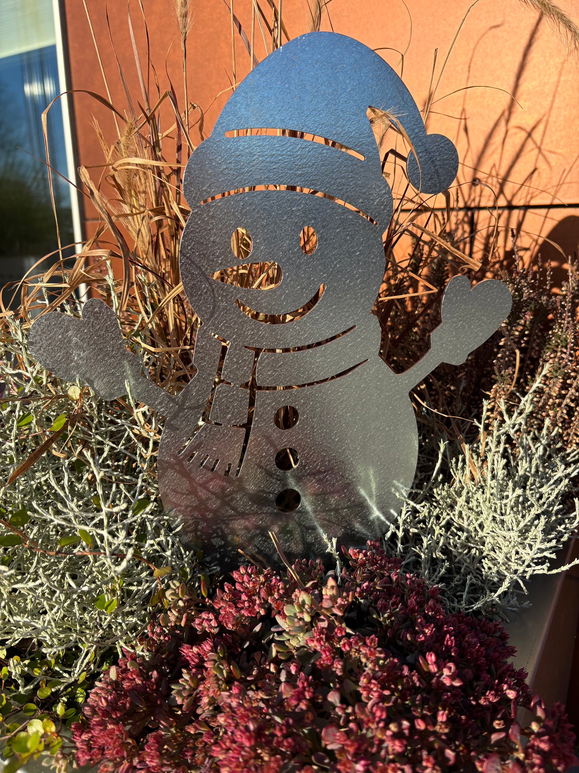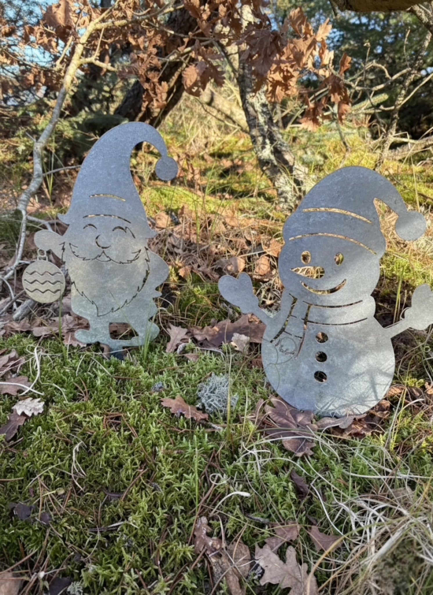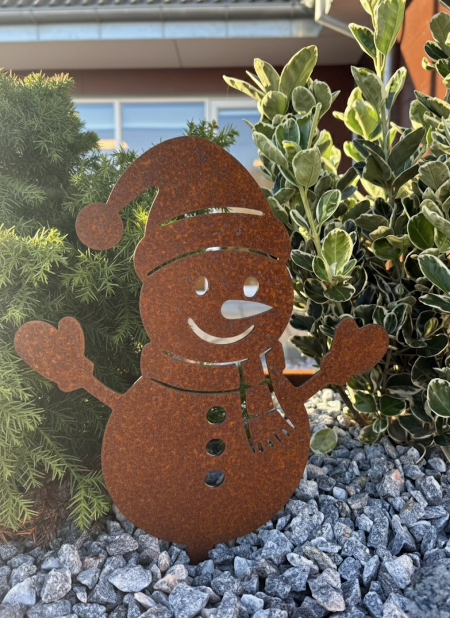 Snemandsfiguren fås i 3 mm cortenstål, som gradvist udvikler en smuk rustpatina – eller i 2 mm galvaniseret stål, der giver et mere lyst og råt look.