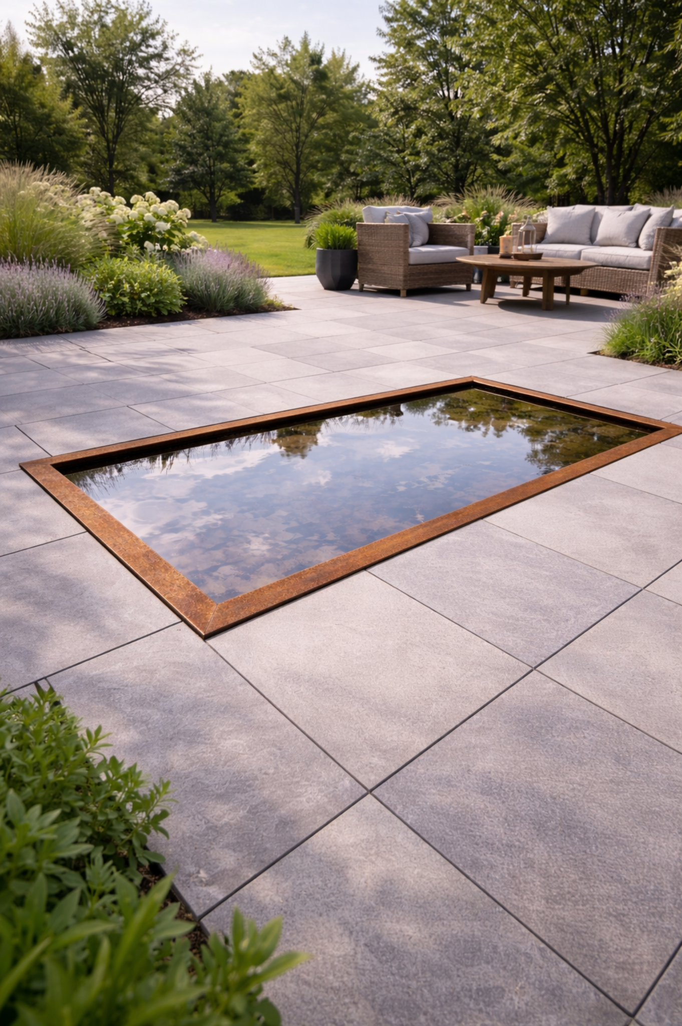 Spejlbassin i corten stål – skab ro, refleksion og stemning i haven
