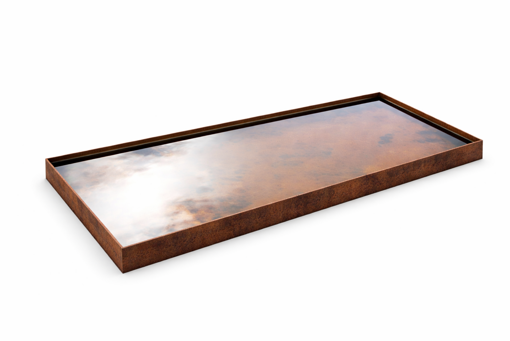 Dette spejlbassin er fremstillet i 3 mm cortenstål, som med tiden udvikler et smukt og varmt rustfarvet patina. Det giver bassinet et naturligt og råt udtryk, der passer perfekt ind i både moderne og klassiske haver.